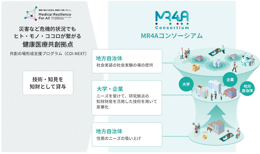 ① 災害や感染症などの危機的状況においても、「ヒト・モノ・ココロ」がつながる健康医療共創拠点で生まれた知的財産・研究成果を再活用し、産業化・ビジネス化を推進するプラットフォームです。